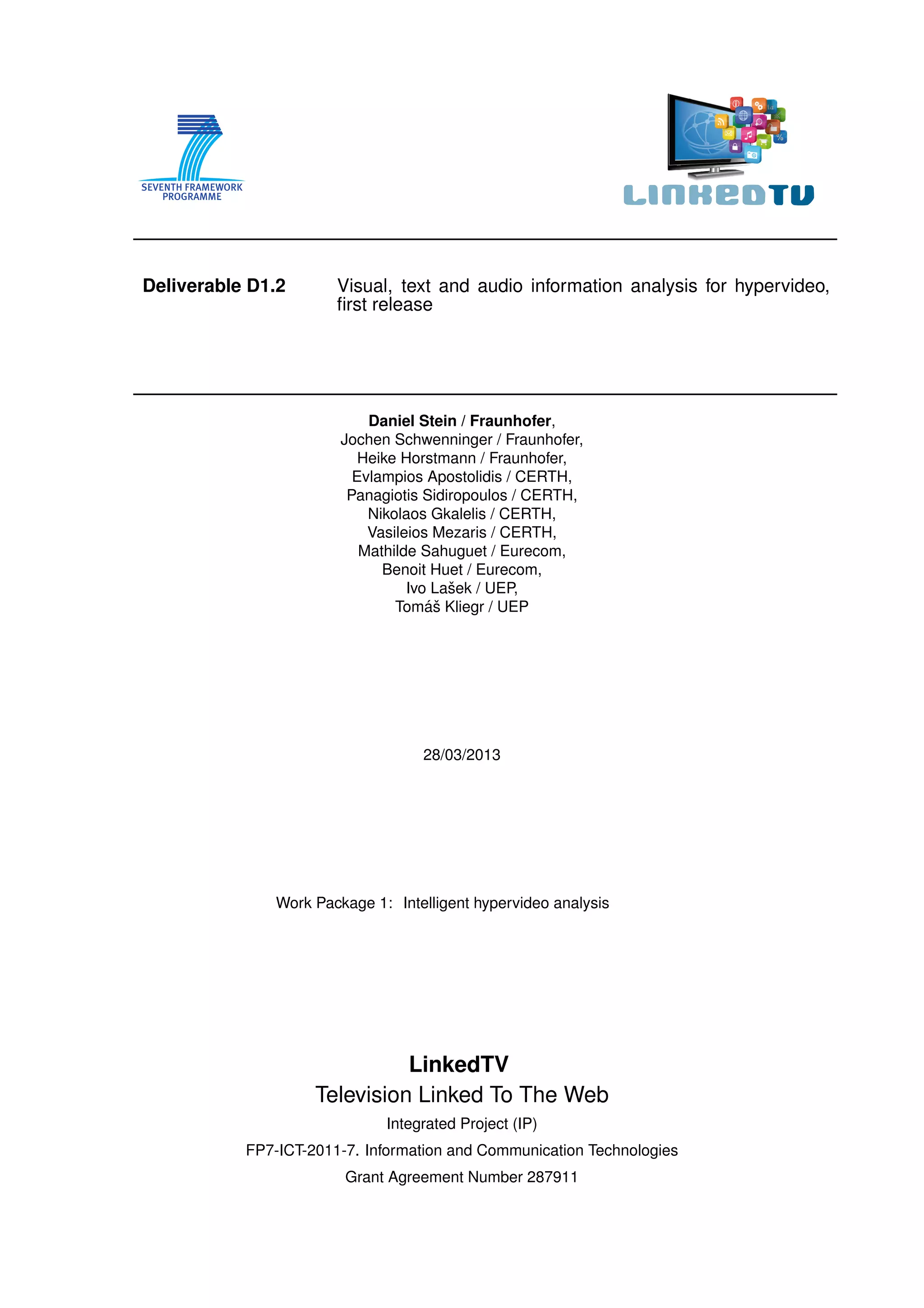 This document provides an overview and evaluation of various visual, text, and audio analysis techniques developed by the LinkedTV project for analyzing hypervideo content. It describes approaches for shot segmentation, face detection and recognition, video concept detection, audio analysis including speech recognition and fingerprinting, keyword extraction and named entity recognition, and video event detection. For each technique, it discusses the state-of-the-art, the LinkedTV approach, experimental evaluations comparing it to other methods, and conclusions. The goal is to select the most appropriate analysis methods for enabling continuative and related information to be linked to videos.