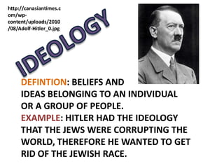 This document defines and provides examples of various sociological and political concepts. It discusses ideologies like individualism and collectivism. It also examines concepts such as competition, private property, rule of law, belief, value, individual identity, and collective identity. For each term, it provides a definition and a relevant example to illustrate the meaning. The document uses images to enhance understanding of the concepts.