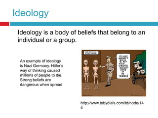 This document defines and provides examples of various political and social ideologies including: ideology, individualism, collectivism, liberalism, self-interest, competition, freedom, rule of law, private property, collective responsibility, collective interest, cooperation, economic equality, collective norms, public property, belief, value, individual identity, and collective identity. Examples are given to illustrate each concept.