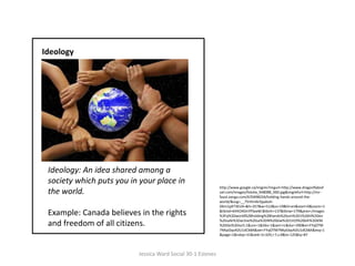 The document contains definitions and examples of various political and social ideologies provided by Jessica Ward for her Social 30-1 class. The ideologies discussed include individualism, collectivism, liberalism, self-interest, competition, freedom, rule of law, private property, collective responsibility, collective interest, cooperation, economic equality, collective norms, public property, belief, value, individual identity, and collective identity.
