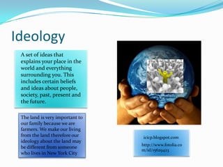 Ideology is a set of ideas that explains one's place in the world and their beliefs about society, past, present, and future. Individual farmers may have a different ideology about land than city dwellers because their livelihood depends on it. Collectivism prioritizes the group over individuals, like in communist systems where people work for the collective good rather than self-interest. Liberalism values individual progress through economic freedom and little government involvement. Under rule of law, all citizens are equal before the law. Collective identity and norms are the shared beliefs and standards expected of group members.