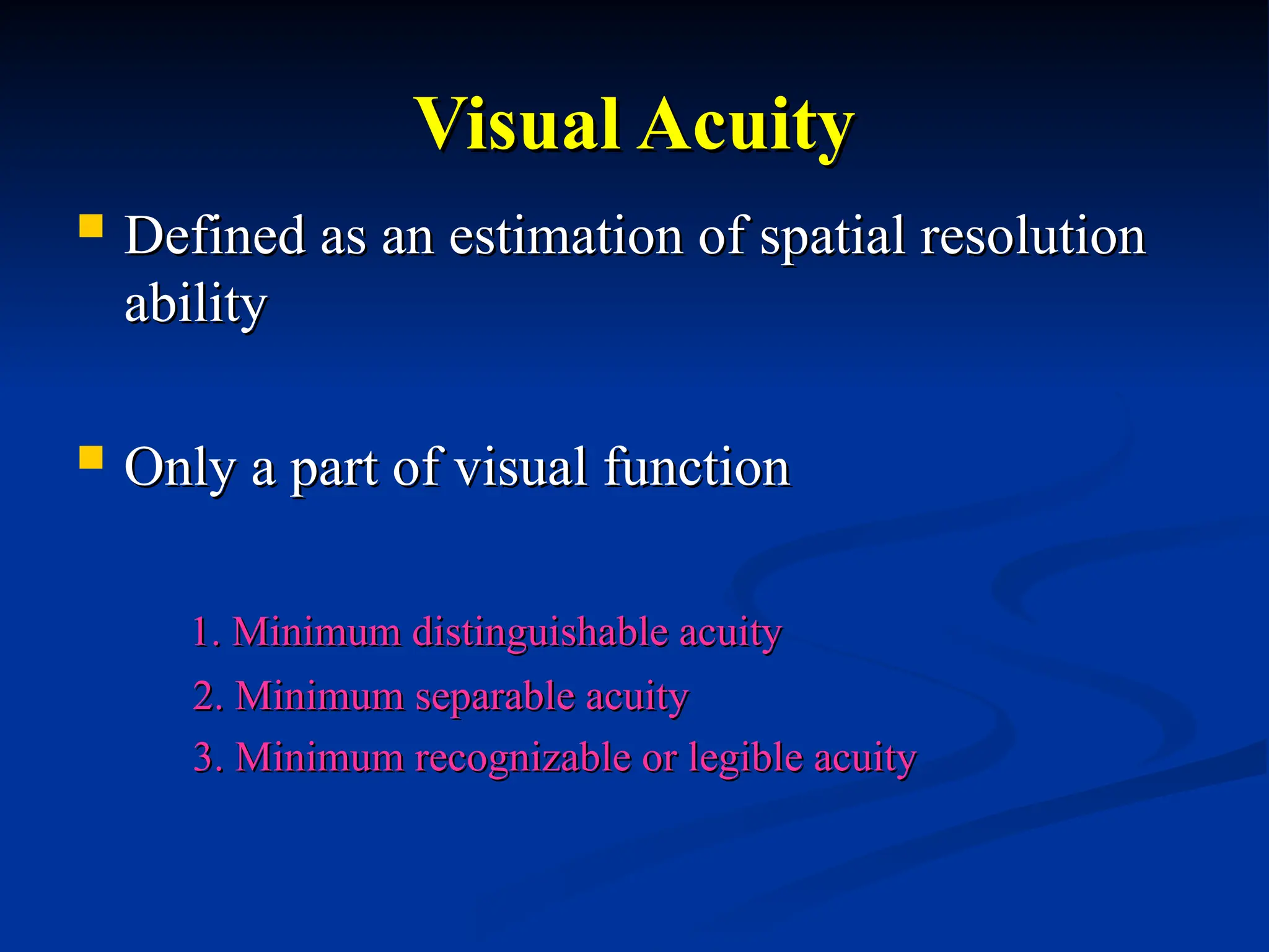 The document discusses visual acuity assessment in children, outlining various methods for testing across different age groups, including infants, toddlers, preschoolers, and school-aged children. It emphasizes the importance of early detection of eye problems and describes several testing techniques such as fixation preference, optokinetic nystagmus, and different acuity charts. Additionally, the document covers the evaluation of binocular vision and provides guidance on creating a child-friendly testing environment.