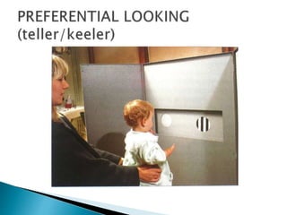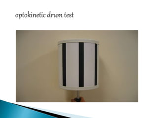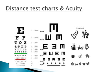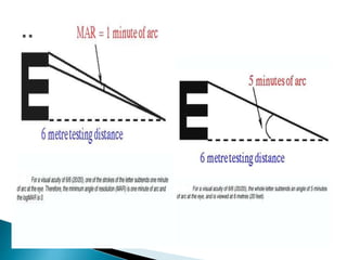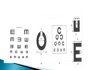 3. It discusses different tests used to measure visual acuity in adults and children, including Snellen charts, Landolt C charts, and preferential looking tests for infants.