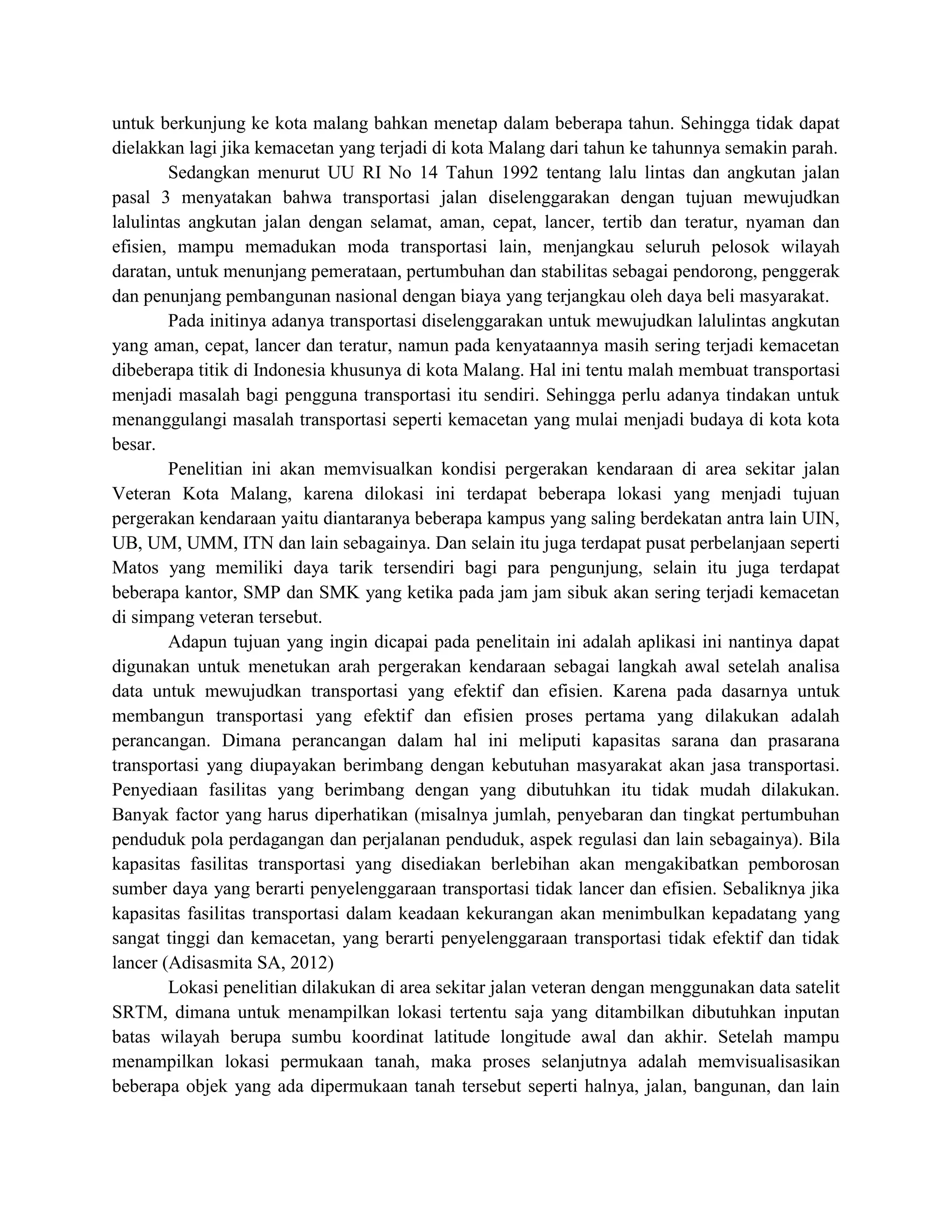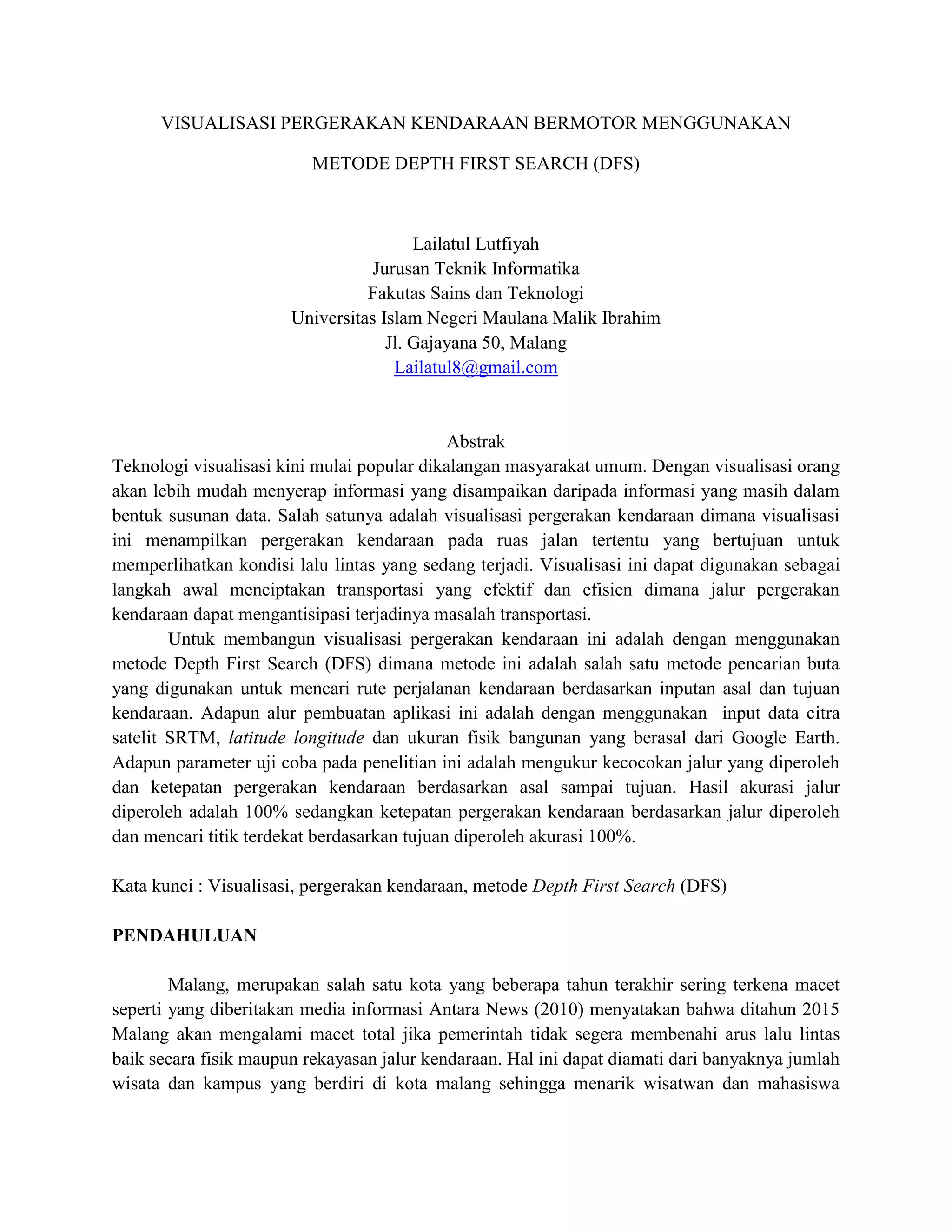 Dokumen ini membahas tentang visualisasi pergerakan kendaraan di kota Malang menggunakan metode Depth First Search (DFS). Hasil uji coba menunjukkan bahwa metode ini dapat dengan akurasi 100% menentukan rute perjalanan kendaraan berdasarkan data yang di input. Penelitian ini bertujuan untuk menciptakan sistem transportasi yang lebih efektif dan efisien dengan memperhatikan kondisi lalu lintas yang ada.
