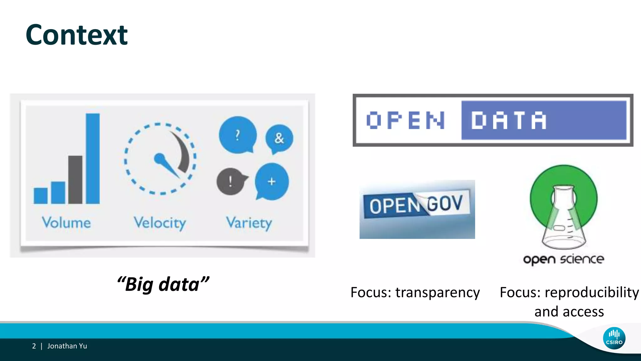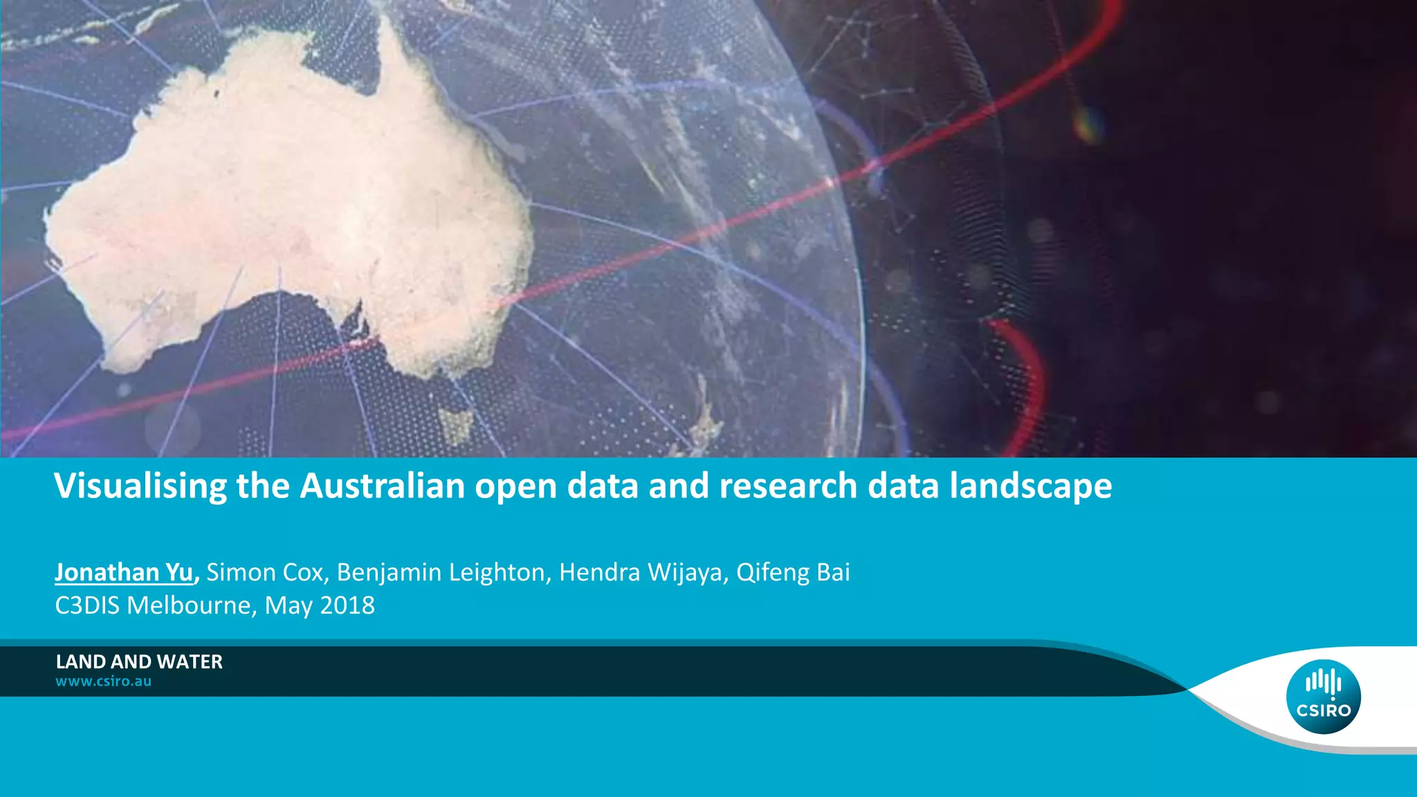 The document presents an analysis of the open data landscape in Australia, highlighting the need for increased transparency and reproducibility. It includes a quantitative survey that assesses the volume, variety, and interoperability of datasets while noting Australia's high ranking in open data access. Future work is proposed to better understand the usage and complexities of open research data alongside governmental data.