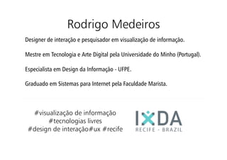 Rodrigo Medeiros, a designer and researcher in information visualization, discusses the importance of data representation in making sense of real-world information. He highlights various applications and projects that utilize data visualization to tell stories and raise awareness, particularly in public information contexts. The document also touches on the potential for developing data visualization initiatives in Recife, Brazil.