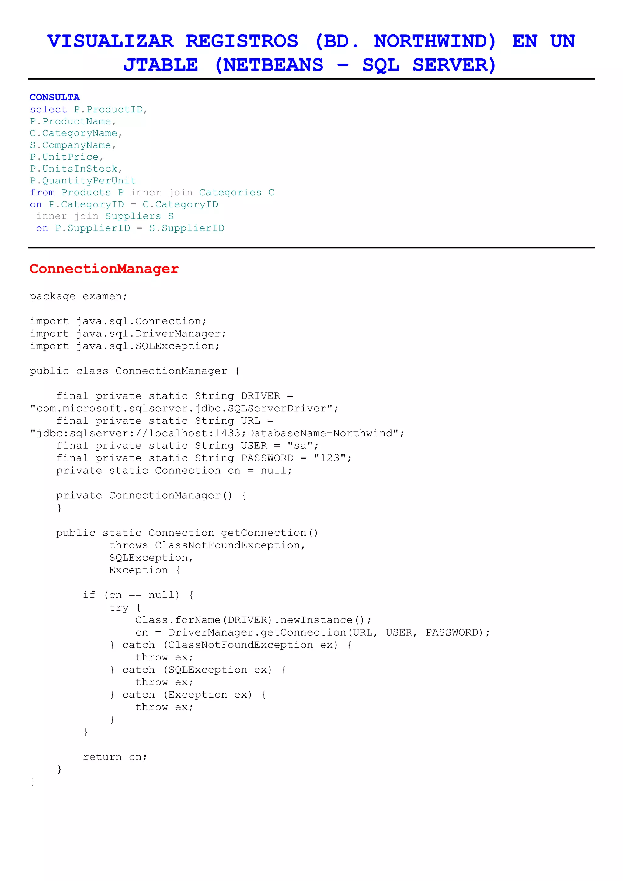 This document discusses how to display records from a Northwind database in a JTable using NetBeans and SQL Server. It includes code to connect to the database, define a Product class with getters and setters, a ProductDAO class to retrieve data, and a GUI class to display the results in a JTable. The code retrieves product data including ID, name, category, supplier, price, quantity and units from the database and displays it in the table.