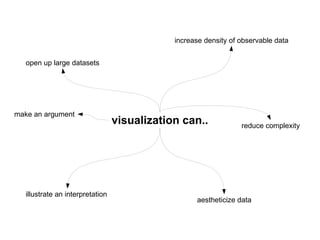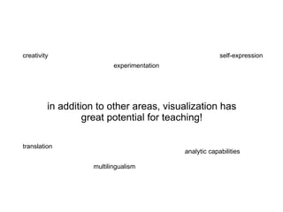 The document discusses the role of visualization in digital humanities, emphasizing its importance in analyzing large volumes of information through various graphical elements. It explores the transition from traditional quantitative data visualizations to including non-numerical and multivariate data, aiming to democratize information and promote creativity. Additionally, it highlights the teaching potential of visualization in enhancing analytical capabilities and fostering self-expression.