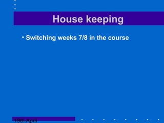 This document summarizes a lecture on advanced human-computer interaction. It discusses external representations and interactivity, types of representations including those of data values and data structure, and types of interactivity such as filtering, labeling, and animated navigation. Effective representations reduce cognitive load, organize information, and structure data to ask questions. However, finding the right representation is still challenging. Interactivity allows users to explore data in an iterative dialogue. The spreadsheet is presented as a killer application due to its interactivity.