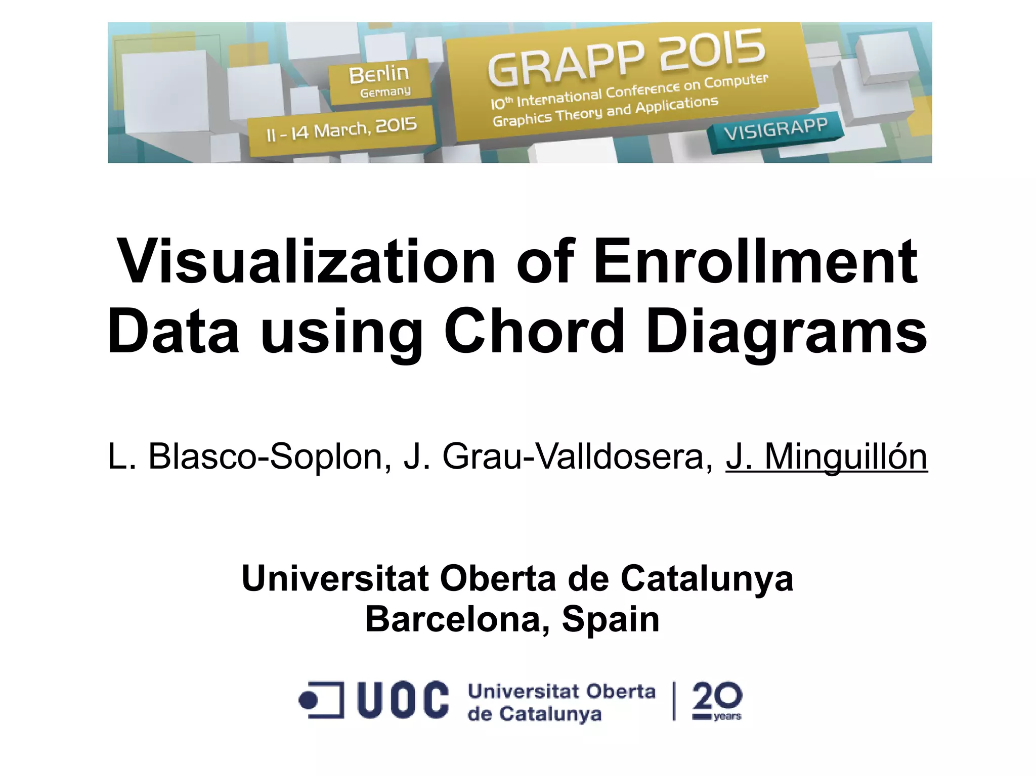 This document discusses visualizing enrollment data from an open university using chord diagrams. It analyzes subject combinations and visualizes intra-semester and inter-semester enrollment patterns. Chord diagrams show relationships between subjects as segments connected by chords. This allows exploration of popular subject combinations and pass/fail rates. The visualization is interactive, providing subject and combination details. While effective, it has limitations like complexity with many subjects and lack of data for uncommon choices. Future work includes evaluation, alternative visualizations, and integrating it into the enrollment process.