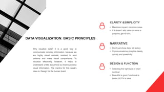 This document provides an overview of commonly used data visualization types and best practices for designing effective visualizations. It discusses chart types like bar charts, histograms, line charts, area charts, pie charts, scatter plots, bubble charts, box-and-whisker charts, and heatmaps. For each type, it provides examples of appropriate uses and tips on how to design the visualizations for clarity and to tell a story with the data. The document emphasizes selecting the right chart for the data and audience and designing for simplicity and functionality over just aesthetics.