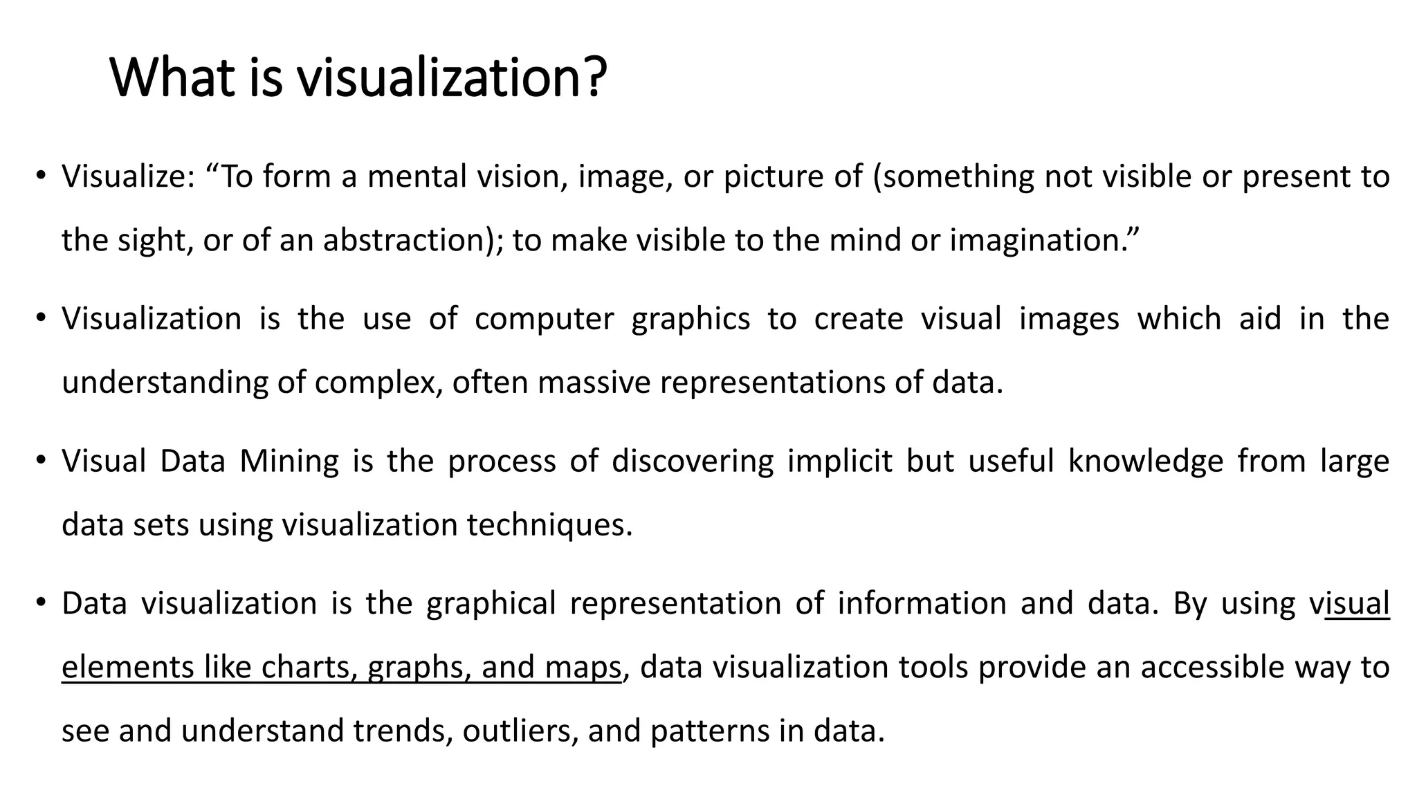 Visualization is the use of computer graphics to create images that simplify the understanding of complex data, with techniques such as data visualization, visual data mining, and traditional visualization methods like charts and graphs. It plays a crucial role in analyzing large datasets, making data more accessible and interpretable, especially in the age of big data. While effective visualization can tell powerful stories and highlight trends, it may also lead to inaccuracies if designed poorly.