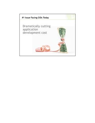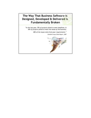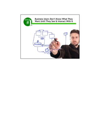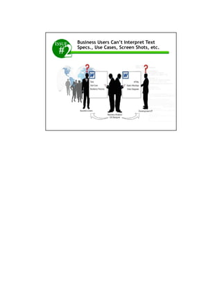 The BI team used iRise Studio to model proposed workflow improvements to the Veterans Health Information Systems and Technology Architecture (VistA) Computerized Patient Record System (CPRS) for the Veterans Health Administration (VHA). They identified 8 high-value, frequently performed clinical tasks and worked with clinicians at 4 VA medical centers to analyze inefficiencies. Using iRise, they created simulated "as-is" and "to-be" screens to validate recommended changes with clinicians. Key strengths of iRise included its ability to rapidly create models, modify screens in real-time, and simulate system interactions without a network connection. The BI team recommends testing models with realistic scenarios, using a mix of screen captures and