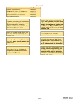 The document contains data on various industries from 2008-2018 including average rates, monthly rates, and yearly rates. It analyzes the computer systems design industry, which had the highest average rates in recent years, as well as the building inspection industry, which had the lowest. The data shows all industries increased over the 10-year period from 2008 to 2018. The document also notes September had the highest values across industries each year.