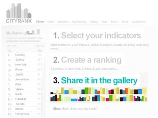The document presents a tool for visualizing and exploring city indices, developed by Seth Flaxman and colleagues, aimed at providing insights into city data. It discusses challenges related to ranking cities, such as defining what constitutes a 'city' and the implications of user-generated rankings. The document also touches on future research opportunities and questions related to the relevance of cities amid economic changes.