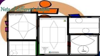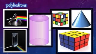 A polyhedron is a three-dimensional solid shape bounded by flat polygons. It has faces, edges, and vertices. Faces are the flat polygons that make up the sides of the polyhedron. Edges are the lines where faces meet. Vertices are the points where edges intersect. Regular polyhedra have identical regular polygons for faces and the same number of faces meeting at each vertex. Prisms and pyramids are examples of polyhedra. Euler's formula relates the number of faces, edges and vertices of any polyhedron as F + V = E + 2.