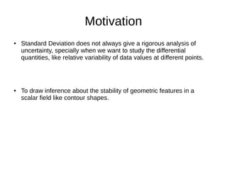 This document summarizes a research paper that presents techniques for visualizing uncertainty in 2D scalar fields. It derives parameters to quantify gradient uncertainty based on data variability. It describes analytical expressions for the probability distributions of gradient magnitude and orientation. A color diffusion technique indicates slope stability, and colored glyphs depict iso-contour uncertainty. The methods are demonstrated on synthetic and seismic ensemble data.