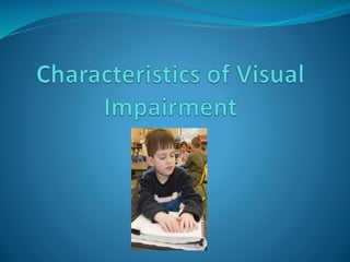 Visual impairment is defined as a functional loss of vision rather than an eye disorder itself. There are four types: partially sighted, low vision, legally blind, and totally blind. Low vision refers to severe visual impairment that affects both distance and near vision, requiring accommodations like large print or Braille. Legally blind means having 20/200 vision or less in the better eye with a limited field of view. Signs of visual impairment include sitting too close to screens, squinting, and rubbing eyes. Academic performance can suffer in areas relying on visuals like reading, diagrams, and maps. Assistive strategies include Braille materials, notes, seating near the front, verbal cues, peer assistance, and assistive