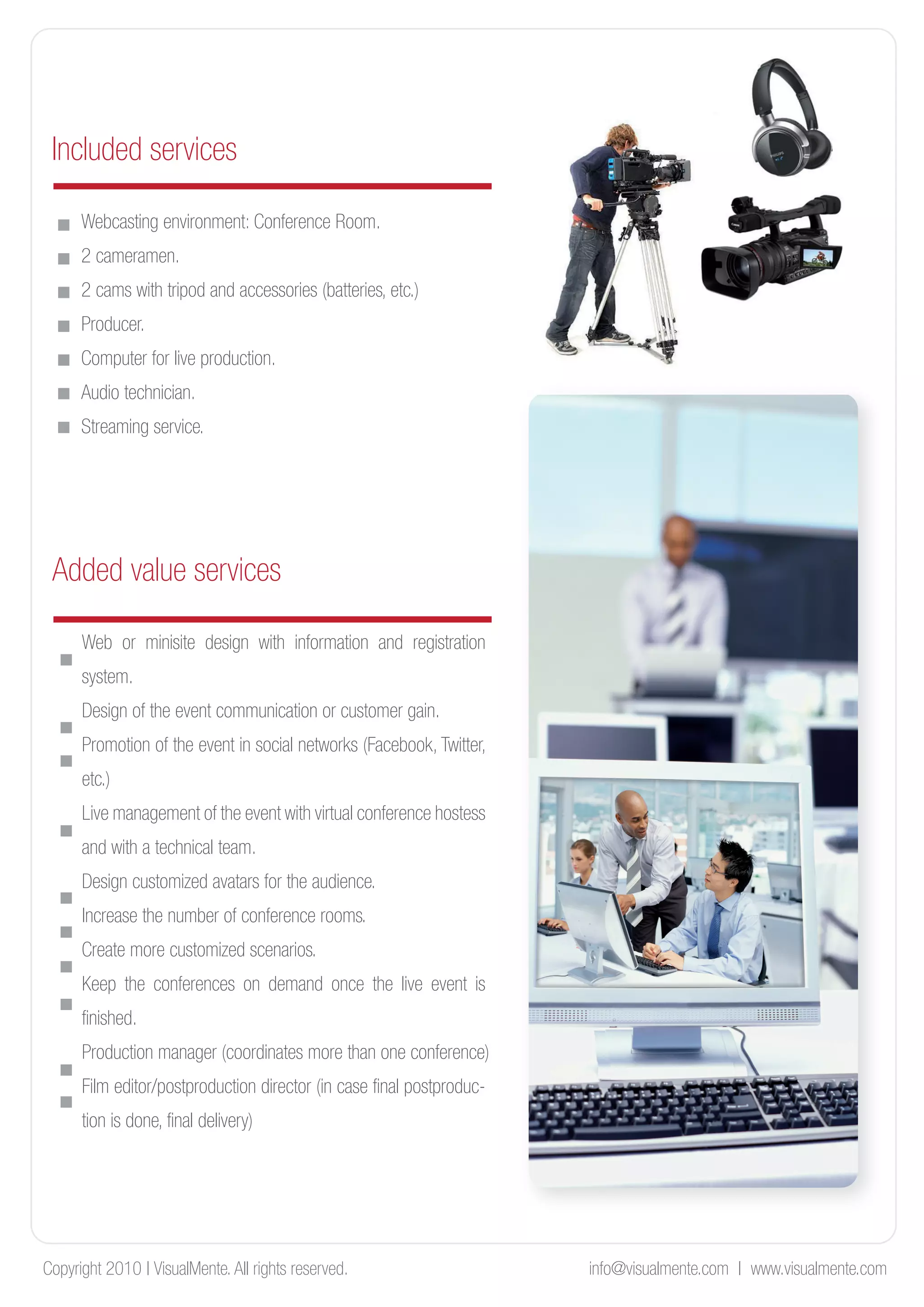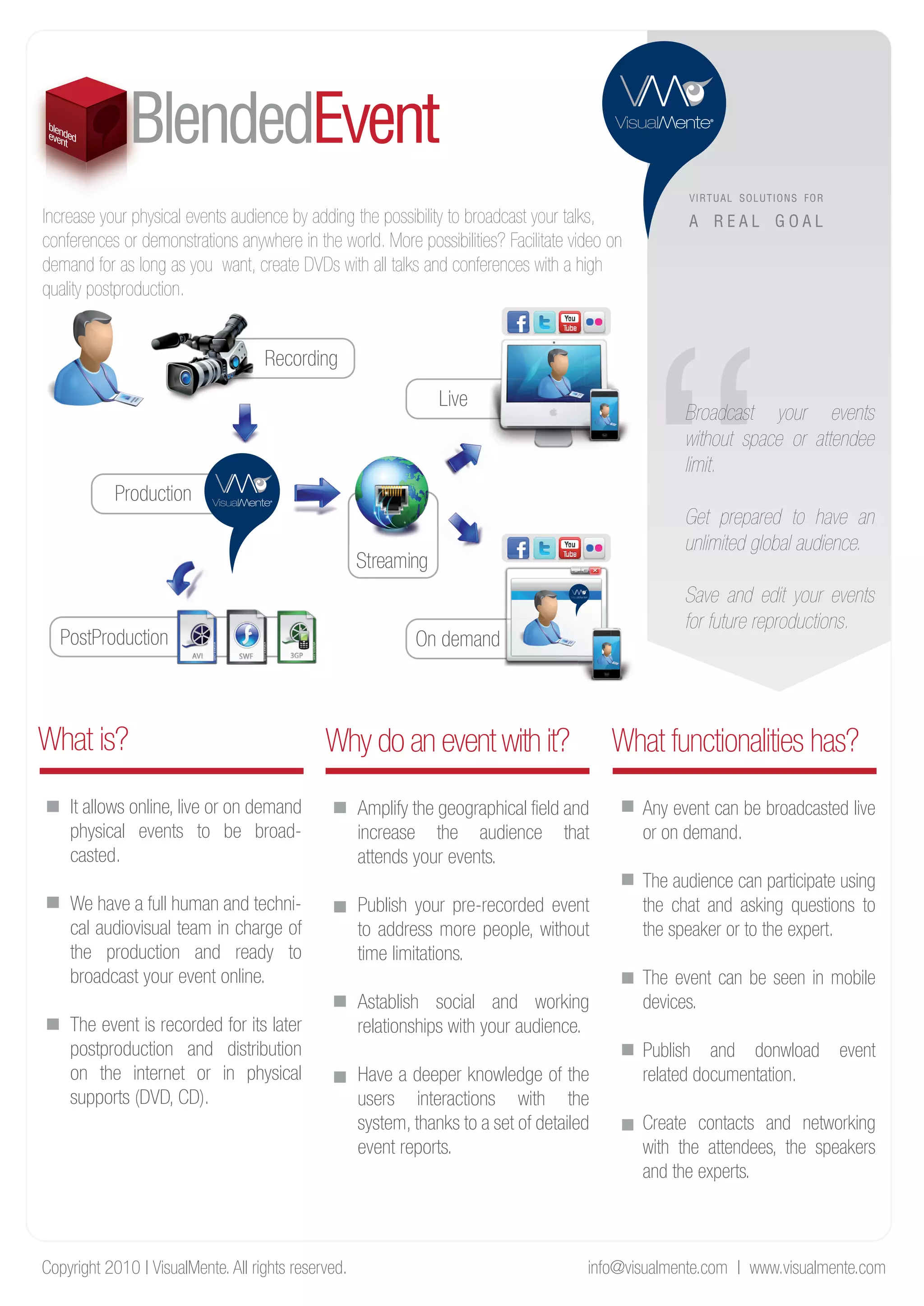 BlendedEvent allows physical events to be broadcast live or on demand to increase audiences globally. Their full audiovisual team handles event production and broadcasting, while recording events for later distribution. This gives events unlimited audiences, facilitates networking, and allows gathering audience insights through reporting. Services include webcasting, cameras, livestreaming, and on-demand access to archived events.