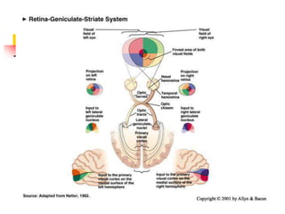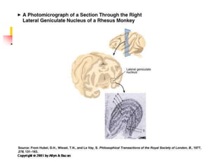 This document discusses the visual system and perception of contrast and color. It covers topics like lateral inhibition in the retina, receptive fields of neurons in the retina-geniculate-striate pathway, simple and complex cortical cells, and Hubel and Wiesel's model of striate cortex organization. Specifically, it describes how receptive fields are circular and smaller in the fovea, exhibiting greater acuity. It also explains that simple cells respond to bars or edges in a particular location and orientation, while complex cells respond to a stimulus anywhere in their large receptive field.