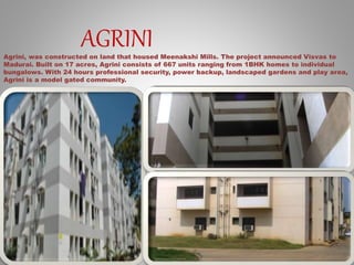 RVA Architecture is the principal architect for Visvas Promoters, Madurai's largest residential developer. Visvas introduced gated communities to Madurai when the concept was still new in southern cities. Visvas has built and managed community spaces in each of its projects, which are appreciated for their quality. Visvas relies on customer word-of-mouth rather than other advertising.