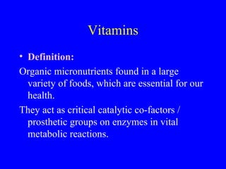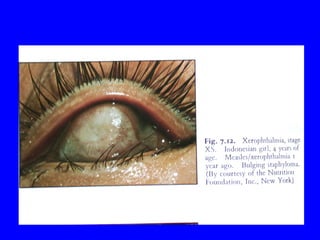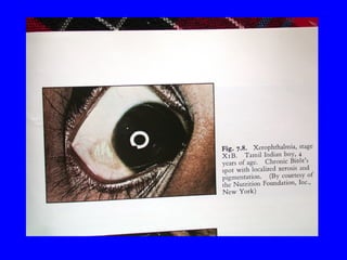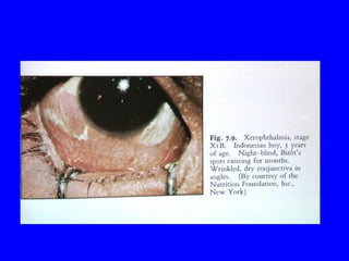 Vitamins are organic micronutrients found in foods that are essential for health. Vitamin A deficiency can occur due to malabsorption or other issues affecting fat absorption. Key symptoms include night blindness, keratomalacia (softening and ulceration of the cornea), papular desquamation (flaking of the skin), and frequent respiratory infections. Vitamin A is important for maintaining epithelial surfaces and its deficiency can lead to epithelial metaplasia and keratinization of tissues.
