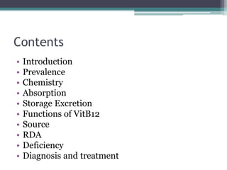 Vitamin B12 is the last vitamin discovered and is essential for nervous system and blood cell formation. Deficiency is common, affecting over 50% of women and 30% of men. It is produced by bacteria and contains cobalt. Absorption requires intrinsic factor in the stomach and occurs in the ileum. Deficiency can result from lack of intake, intrinsic factor deficiency causing pernicious anemia, or absorption issues from diseases or drugs impairing absorption. Diagnosis involves blood tests and the Schilling test to identify the cause of deficiency. Treatment involves B12 injections or high dose oral supplementation.