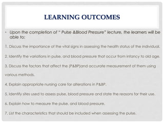 This document provides an overview of vital signs, with a focus on pulse and blood pressure. It defines key terms like pulse, blood pressure, and their normal ranges. Factors that can affect pulse and blood pressure are discussed, like age, exercise, medications, and medical conditions. Methods for assessing pulse and blood pressure are presented, including appropriate sites and techniques. Indications for assessing apical pulse versus peripheral pulse are outlined. Overall, the document aims to describe important concepts for understanding, measuring, and interpreting pulse and blood pressure.