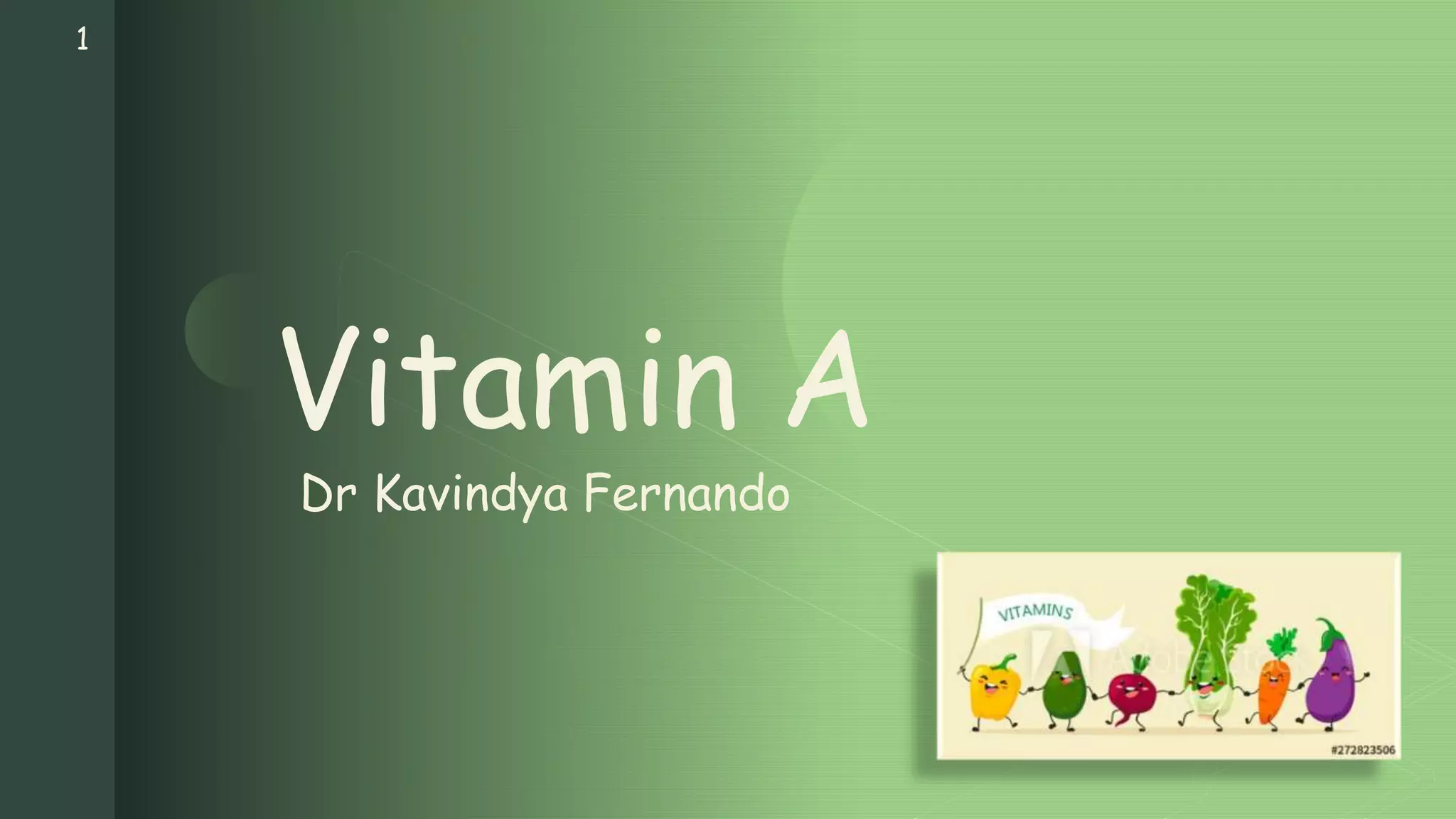 Vitamin A is a fat-soluble vitamin with four forms: retinol, retinal, retinoic acid, and β-carotene. It plays a crucial role in maintaining vision, growth, reproduction, and epithelial differentiation, and is also therapeutically important in treating conditions like psoriasis and severe acne. The daily requirement for adults is measured in retinol activity equivalents, with 900 RAE for males and 700 RAE for females.