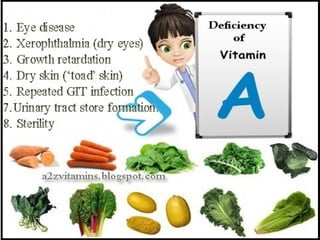 Vitamin A deficiency is a major public health problem worldwide, especially in Africa and South Asia. It can cause blindness and increases the risk of death from infections in children. The first signs are night blindness and dryness of the conjunctiva. More severe deficiency can lead to Bitot's spots, corneal ulceration and keratomalacia which can cause scarring and permanent blindness. Increasing intake of foods rich in preformed vitamin A such as liver, eggs, dairy or carotenoid-rich fruits and vegetables can help prevent and treat vitamin A deficiency.