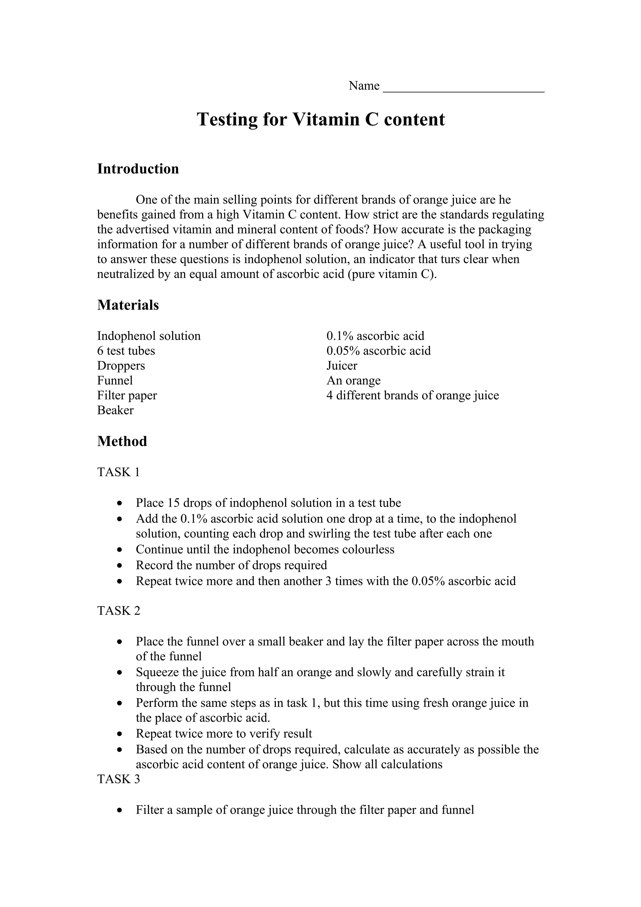 1) The document describes an experiment to test the vitamin C content of fresh orange juice and 4 brands of packaged orange juice using an indophenol indicator solution.