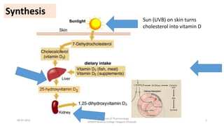 The document discusses vitamin D, including its synthesis from sun exposure, its role in various bodily processes, and its potential health benefits. Key points include: