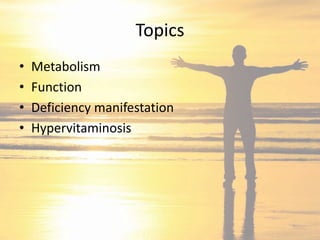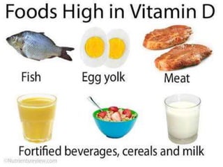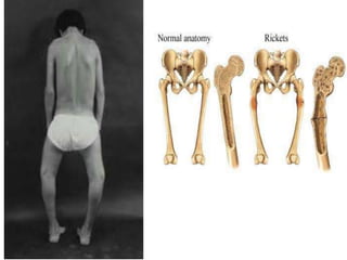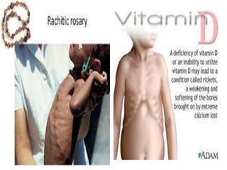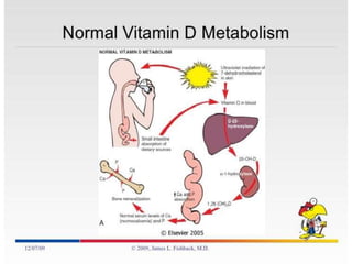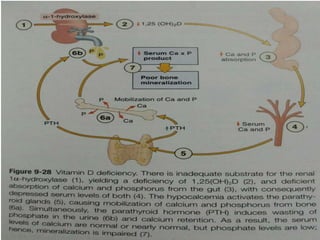 Vitamin D is important for calcium absorption and bone mineralization. It is synthesized in the skin upon exposure to sunlight and is also obtained in smaller amounts from dietary sources. Vitamin D is metabolized in the liver to 25-hydroxyvitamin D and then in the kidneys to its active form, 1,25-dihydroxyvitamin D. This active form works with parathyroid hormone to increase intestinal calcium absorption and renal calcium reabsorption, maintaining normal blood calcium levels and promoting bone mineralization. Deficiencies can lead to rickets in children, causing skeletal deformities, and osteomalacia in adults, weakening bones.