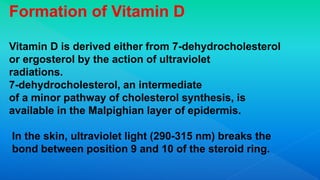 Vitamin D is formed in the skin upon exposure to sunlight and is important for calcium absorption and bone health. It can also be obtained through dietary sources. The document discusses vitamin D formation in the skin, dietary sources of vitamin D, risks of deficiency like rickets and osteomalacia, and recommendations for intake through diet and sunlight exposure.