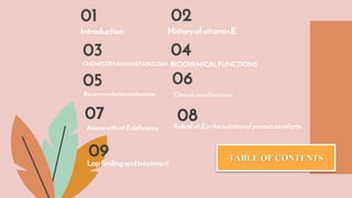 This document discusses Vitamin E, its historical discovery, biochemical functions, and clinical significance, particularly in relation to neurological issues stemming from its deficiency. It highlights the role of Vitamin E as an antioxidant essential for cell membrane integrity, reproductive health, and prevention of heart diseases. Additionally, it addresses its importance for premature infants, recommending dietary sources and supplementation guidelines.