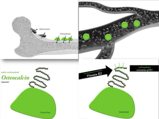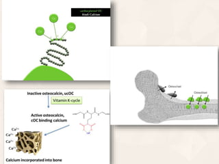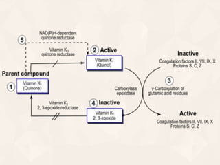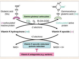 Vitamin K exists in three forms - vitamin K1, K2, and K3. It functions as a coenzyme in the liver to enable the carboxylation of blood clotting factors and proteins involved in bone mineralization. A daily recommended intake of 70-140 μg is needed to support blood coagulation and bone health, with deficiency leading to increased bleeding risks.