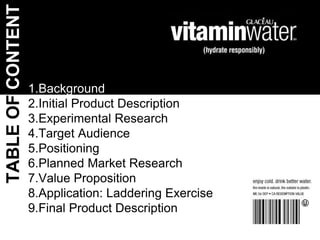 The document outlines a marketing strategy for Vitaminwater, focusing on consumer behavior and product positioning following its acquisition by Coca-Cola. Key findings emphasize consumer preferences for healthiness, low calories, and natural ingredients, while identifying millennials and female household gatekeepers as primary target audiences. Planned market research aims to refine the product's value proposition by addressing taste, health benefits, and packaging to enhance customer loyalty and increase sales.