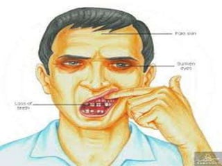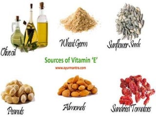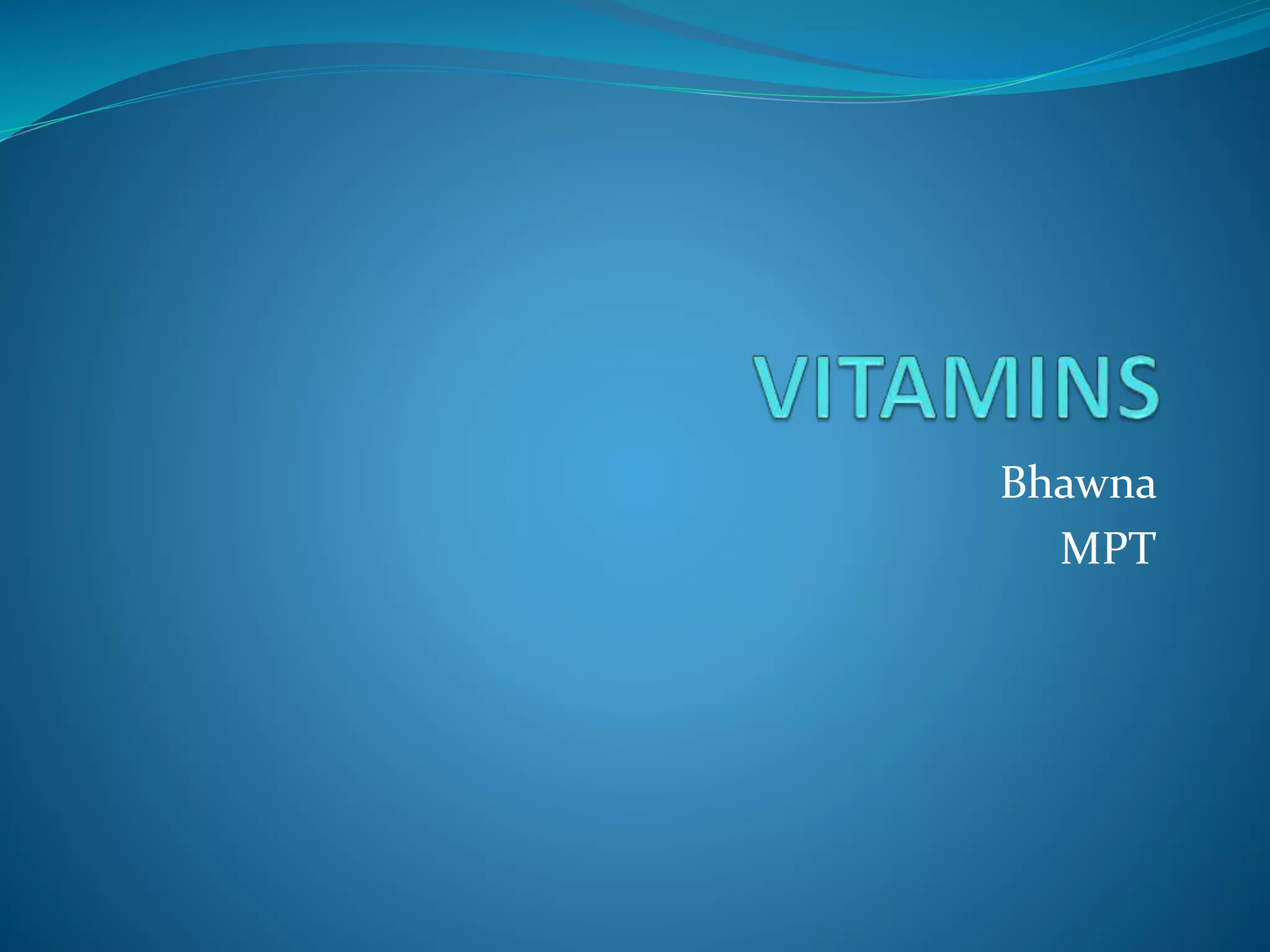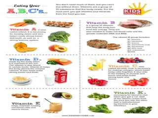 Vitamins are organic compounds that are required in small amounts for various metabolic processes in the body. They are classified as either fat-soluble or water-soluble. Vitamin A supports vision, growth, immunity, and skin health. Vitamin D aids in calcium absorption and bone growth. Vitamin E acts as an antioxidant and protects cell membranes. Vitamin K is essential for blood clotting. Vitamin C is an antioxidant and supports wound healing and collagen production. The B vitamins function as coenzymes in energy production from carbohydrates, fats, and proteins. Deficiencies of various vitamins can lead to conditions like scurvy, beriberi, rickets, and pellagra