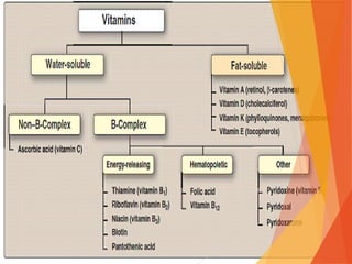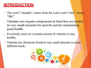The document provides information about various vitamins, including their sources, daily requirements, and functions. It discusses both water-soluble vitamins (B vitamins and vitamin C) and fat-soluble vitamins (A, D, E, K). For each vitamin, there is a section on dietary sources, daily intake recommendations, and the key roles the vitamin plays in the body.
