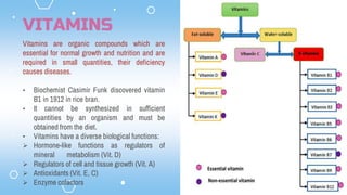 The document provides a comprehensive overview of vitamins, highlighting their classification into water-soluble and fat-soluble types, along with their sources, functions, and deficiency diseases. Key vitamins discussed include A, D, E, K, and various B vitamins, emphasizing their roles in bodily functions like growth, vision, immunity, and metabolism. Recommended daily intakes and specific deficiencies associated with each vitamin are also detailed, stressing the importance of obtaining these nutrients through diet.