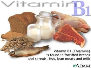 This document discusses vitamins and their classification. It provides details on vitamin B1 (thiamine) including its absorption, daily requirements, deficiency symptoms and management. Deficiency of vitamin B1 can cause beriberi, which has wet and dry forms. Management involves thiamine supplementation. The document also briefly covers other B vitamins and their roles.