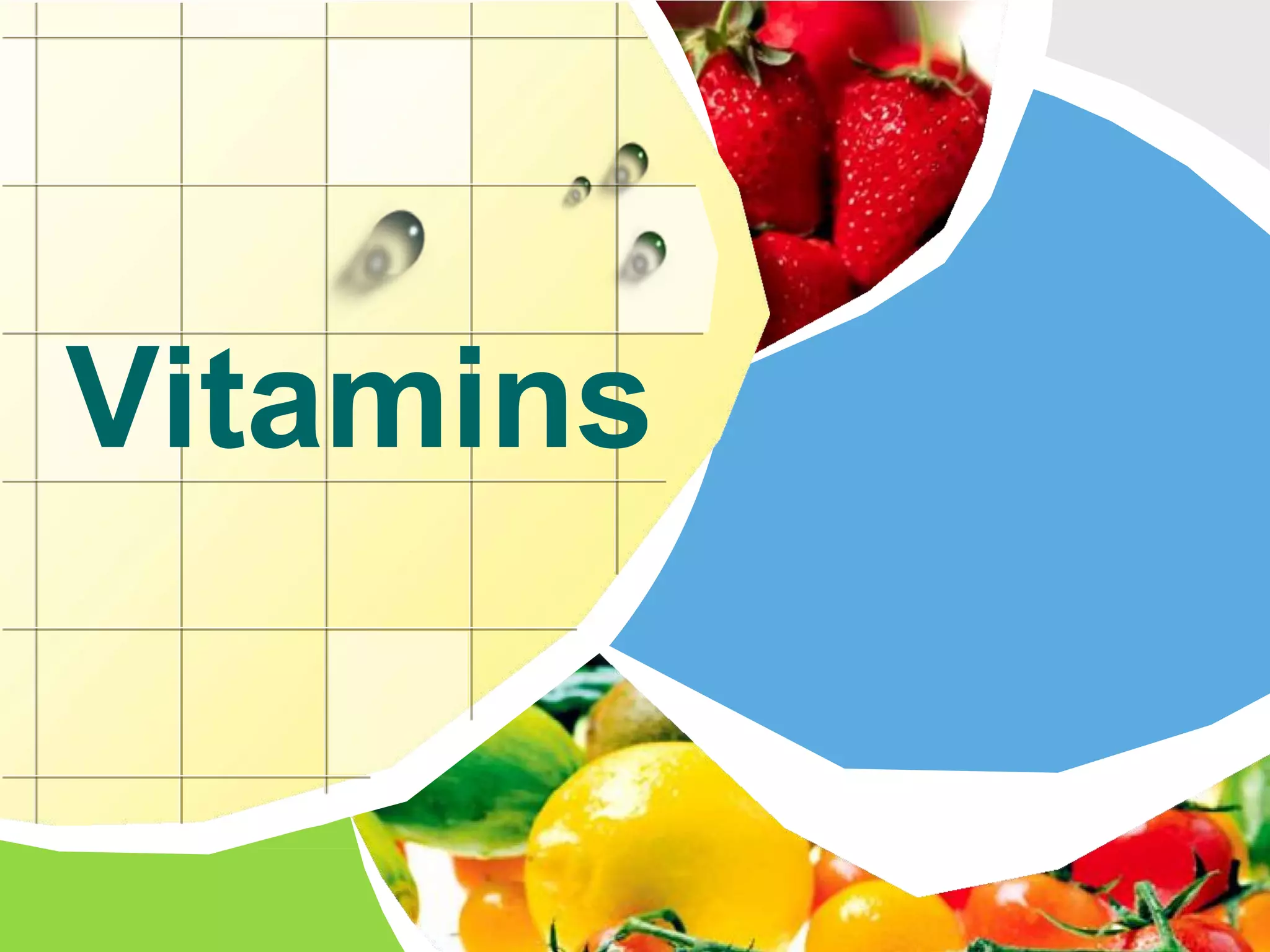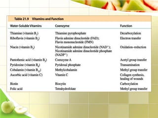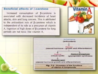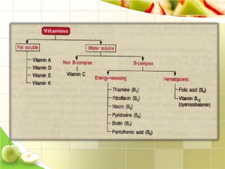 Vitamins are organic molecules that are essential micronutrients obtained through diet. They serve as cofactors for enzymatic reactions in the body. There are two types of vitamins - fat soluble vitamins A, D, E and K which are stored in the body, and water soluble vitamins like the B complex and C which are not stored. Vitamins play important roles like vision, bone formation, acting as antioxidants, and blood clotting. Deficiencies can result in various diseases which were addressed with the identification and isolation of vitamins in the early 1900s.