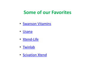 The document provides a comprehensive guide to vitamins and minerals, detailing their food sources, health effects, and functions. It includes essential vitamins such as A, B12, C, D, E, and K, alongside minerals like calcium, iron, and magnesium, explaining their roles in bodily functions and overall health. Additionally, it highlights popular supplements from brands like Swanson and Usana.