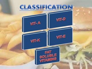 This document discusses the fat soluble vitamins A, D, E, and K. It provides information on their chemical names, sources, functions, and deficiency disorders. Vitamin A is important for vision and is found in liver, eggs, and plants like carrots. Vitamin D aids in calcium absorption and is synthesized from sunlight exposure. Vitamin E functions in cell membrane integrity and vitamin K is required for blood clotting. The document also asks comprehension questions about the vitamins and requests a table summarizing their characteristics.