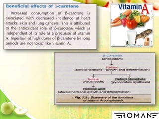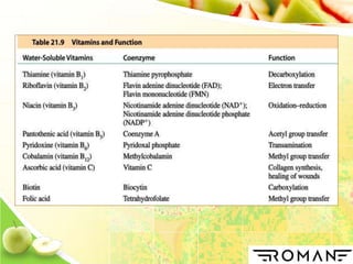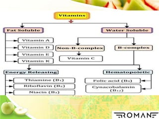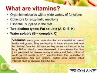 Vitamins are organic compounds that are essential nutrients for normal growth and health. They serve as cofactors for enzymatic reactions and must be obtained from diet as the body does not synthesize them. There are two types of vitamins - fat soluble vitamins A, D, E, K which are stored in the body, and water soluble vitamins like B complex and C which are not stored. Vitamins act as cofactors for enzymes and are involved in various metabolic processes like energy production, amino acid metabolism, vision, bone formation and blood clotting. Deficiency of vitamins can lead to various diseases which can be prevented by obtaining vitamins from dietary sources.