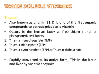 Thiamin (vitamin B1) occurs in the body as free thiamin and phosphorylated forms that are active coenzymes involved in nerve impulse conduction and muscle action. Severe deficiency results in beriberi disease. Riboflavin (vitamin B2) is involved in metabolism as FAD and FMN coenzymes and antioxidant functions. Deficiency causes inflammation of the tongue. Niacin helps form NAD and NADP coenzymes and deficiency causes pellagra skin disease. Pantothenic acid forms the coenzyme A involved in many metabolic reactions.