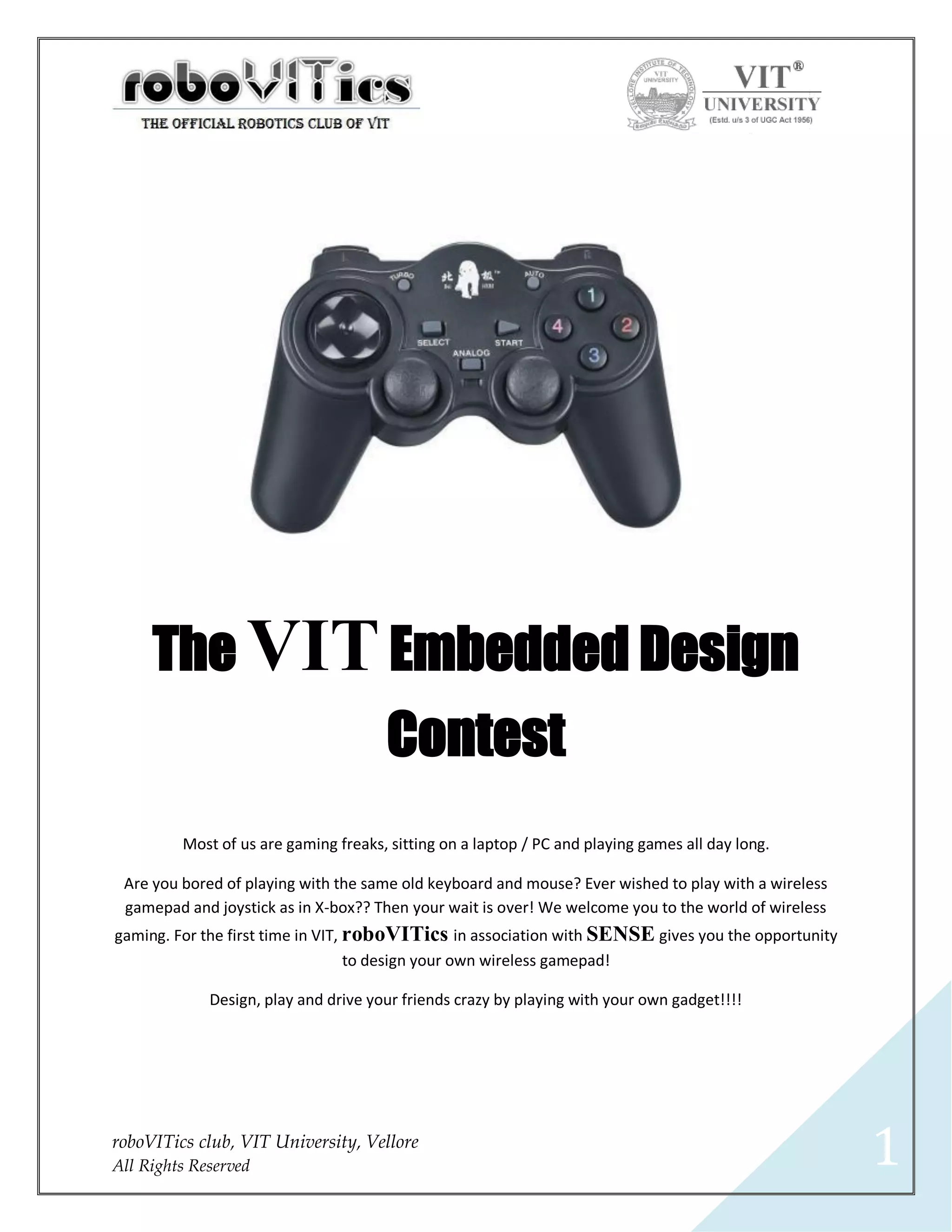 The document announces a contest organized by roboVITics club and SENSE at VIT University to design a wireless gamepad. Participants must design both the hardware and software for a gamepad that contains at minimum directional keys and action buttons, and uses wireless communication like Bluetooth to connect to a computer or laptop. Additional features like analog sticks are encouraged. Teams will be judged based on the effectiveness of their design, simplicity of use, originality, and compatibility with multiple games. The top three teams will receive prizes.