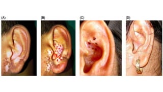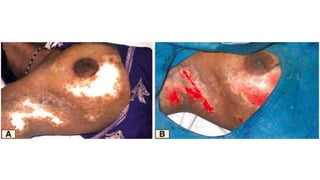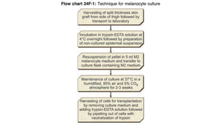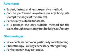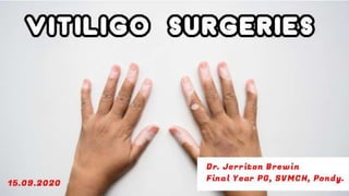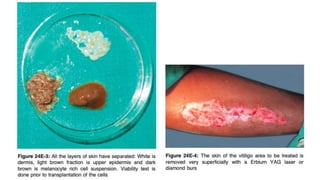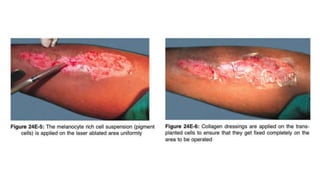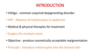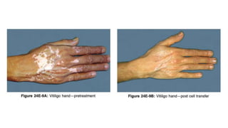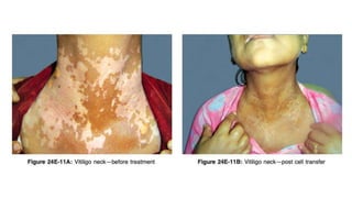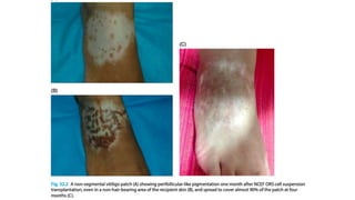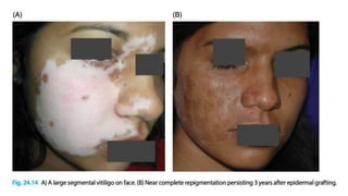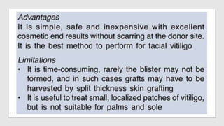 The document discusses vitiligo, an acquired depigmenting disorder, and outlines various treatment options including surgical procedures and grafting techniques aimed at achieving cosmetically acceptable repigmentation. Key factors influencing surgical choices include the type and extent of vitiligo, patient selection criteria, and the advantages and disadvantages of different grafting methods. Ultimately, effective treatments require careful patient evaluation and selection based on stability and expectations.