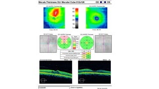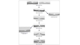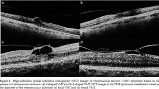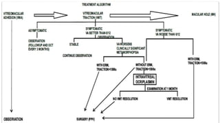 Vitreoretinal interface disorders involve abnormal adherence between the vitreous gel and the retina. Posterior vitreous detachment normally occurs in older individuals as the vitreous liquefies and separates from the retina. Vitreomacular adhesion and traction occur when the vitreous remains abnormally attached to the macula, which can cause macular edema or hole formation. Optical coherence tomography is useful for diagnosing and monitoring these disorders. Treatment may involve observation, pharmacologic vitreolysis to release attachments, or vitrectomy surgery to remove tractional forces on the macula.
