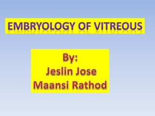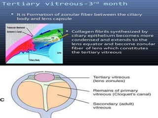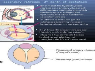 The document discusses the three stages of vitreous development: primitive or primary vitreous, definitive or secondary vitreous, and tertiary vitreous. Primitive vitreous originates partly from mesenchymal and surface ectoderm tissues and contains a vascular system that supplies nutrition to the developing lens. This primitive vitreous regresses by the second month of gestation. Definitive vitreous is secreted by the optic cup and contains type II collagen fibrils and hyalocytes. Tertiary vitreous develops later in gestation and forms the vitreous base and ciliary zonules.